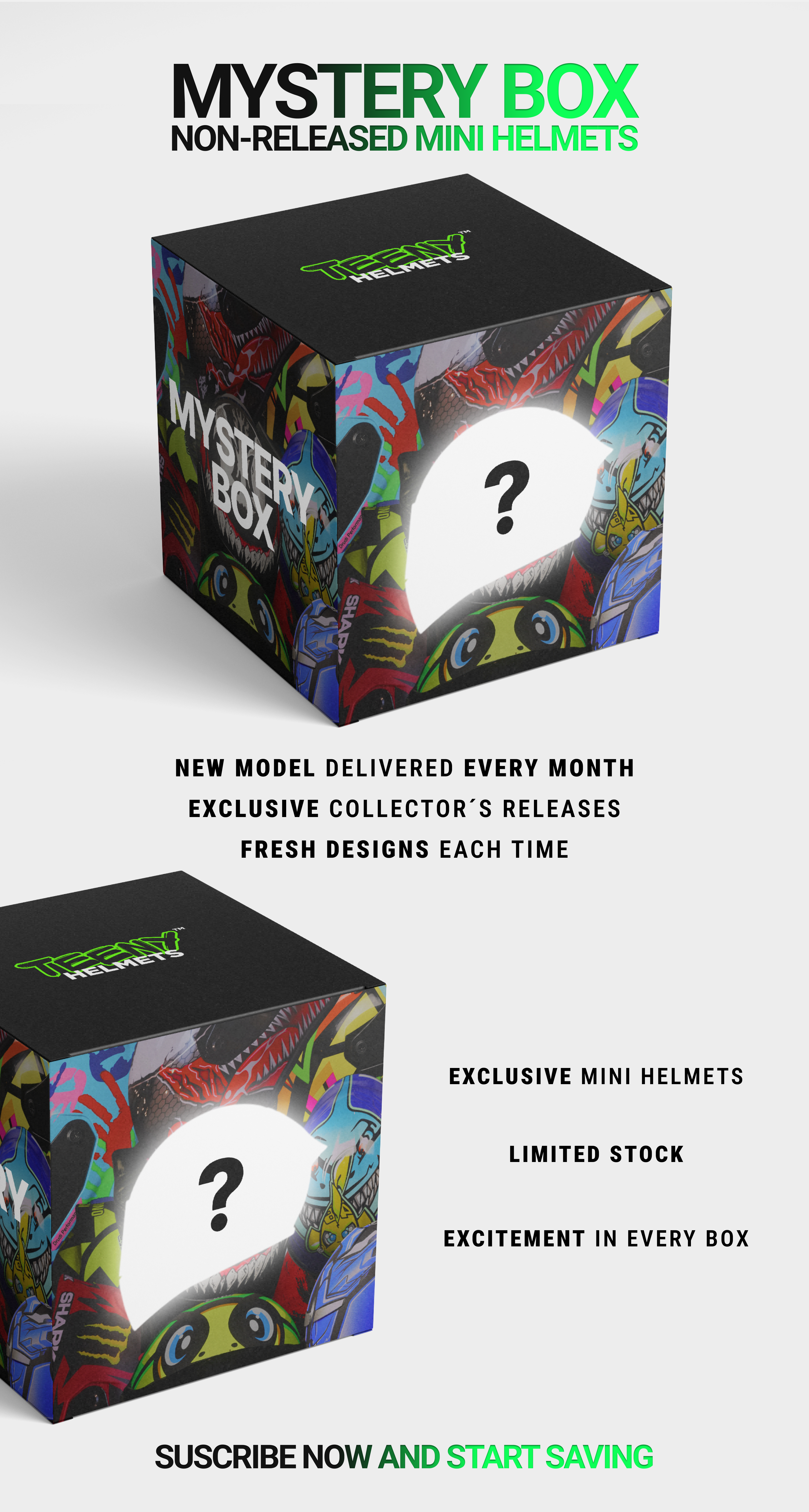 Each Un-Released Mini Helmet Mystery Box contains an Exclusive Teeny Helmet that is not in our catalog, the only way to get it is through our Mystery Box! This is only for the Big Riders!